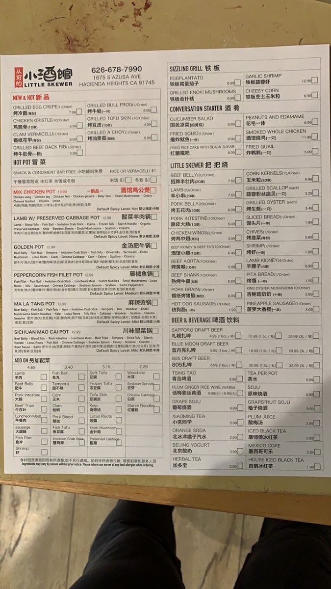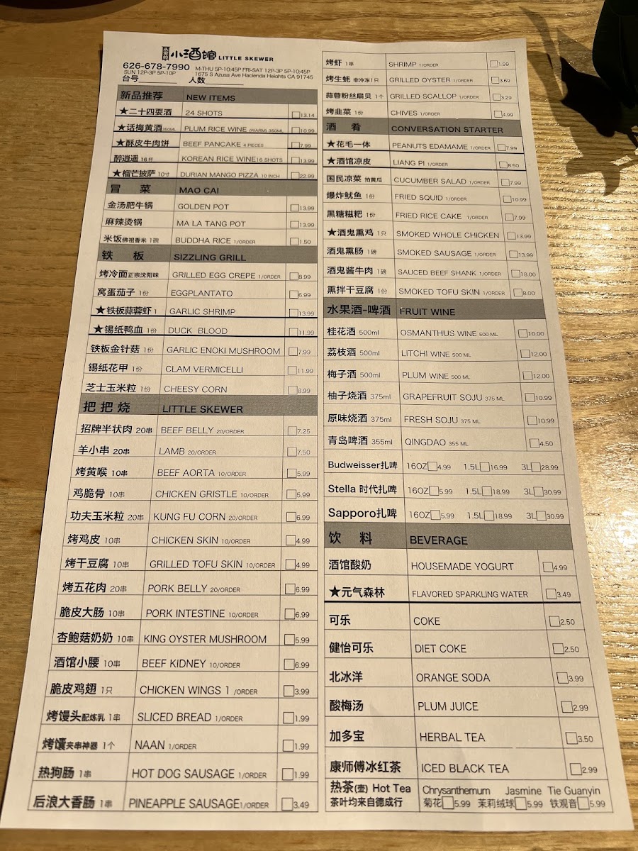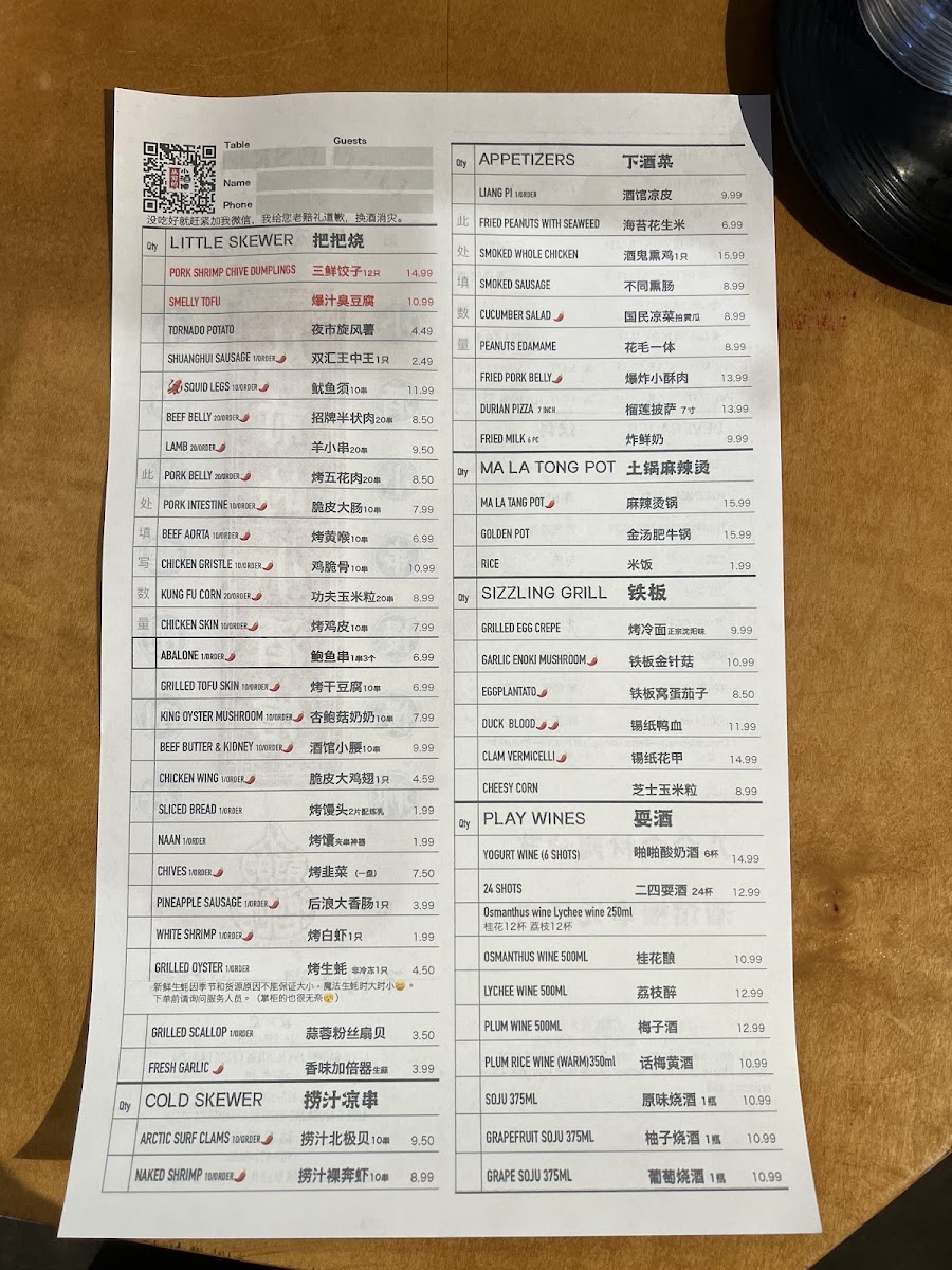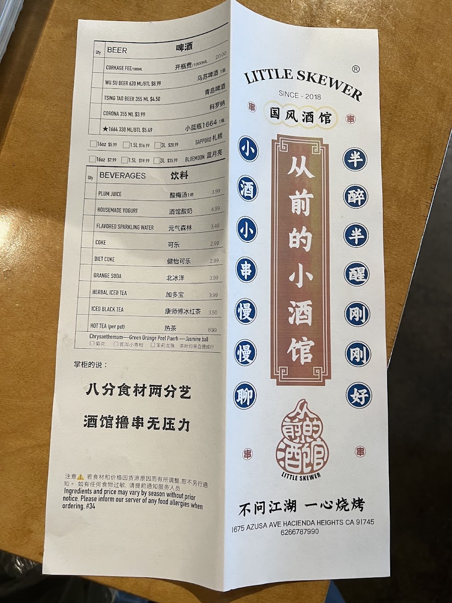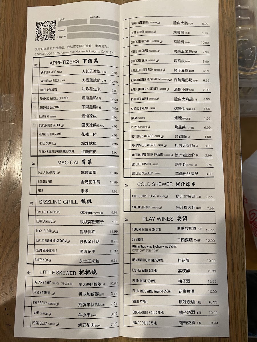 This menu is suited to casual, social meals where guests can mix and match skewers with appetizers and side dishes. The items are often ordered quickly and work well for those looking to sample a variety of traditional Chinese grilled foods and cold dishes. Both smaller portions and larger orders are offered, catering to individual diners as well as groups.